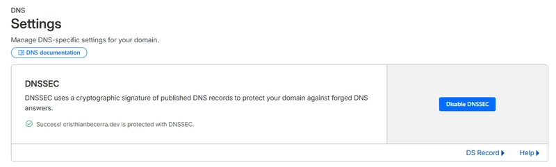 4. En Cloudflare, al revisar nuevamente los DNS Settings del dominio, deberías ver el mensaje: “Success! Your domain is protected with DNSSEC”.