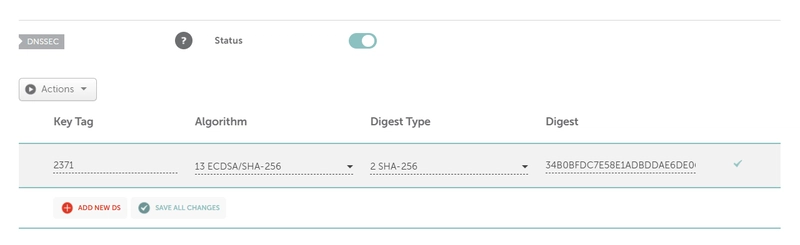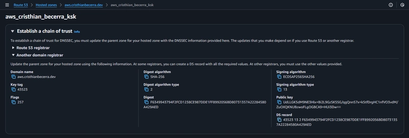 Con esto, se completa la confianza entre Cloudflare y Namecheap. En este punto, toda la cadena de confianza requerida para configurar DNSSEC en tu Hosted Zone de Amazon Route 53 habrá sido establecida exitosamente.