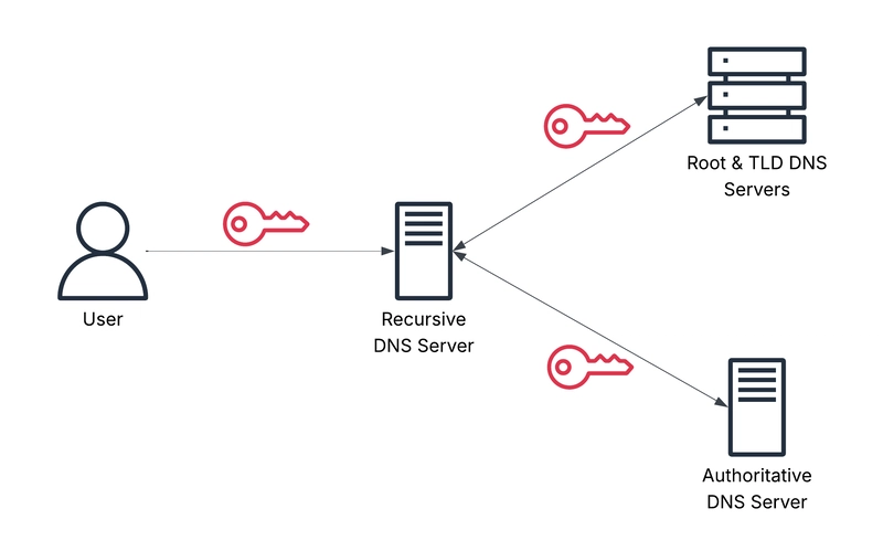 Durante la resolución de un nombre de dominio, cuando un usuario intenta acceder a un sitio web, el resolutor recursivo consulta los registros DNS y verifica la firma digital utilizando la clave pública correspondiente. Si la firma es válida, la respuesta se considera confiable y es aceptada. De lo contrario, se asume que la información pudo haber sido alterada y, por lo tanto, se considera peligrosa, bloqueando el acceso. ⛔