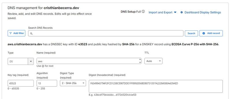 - Completa los valores correspondientes para Key tag, Signing algorithm type, Digest algorithm type y Digest, utilizando la información obtenida desde Route 53.