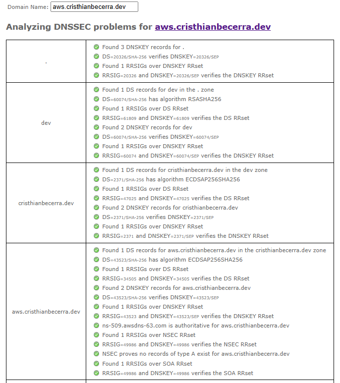 A continuación, estoy compartiendo un análisis de DNSSEC Analyzer con un resultado exitoso, el cual demuestra una correcta configuración de DNSSEC desde Namecheap, pasando por Cloudflare, hasta Amazon Route 53.