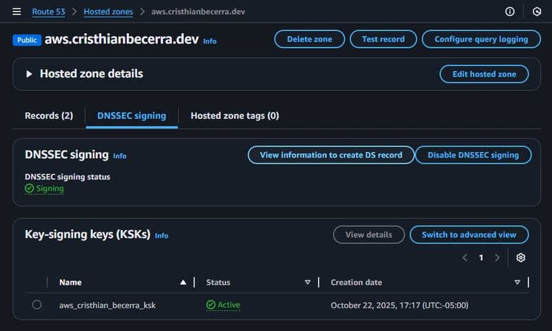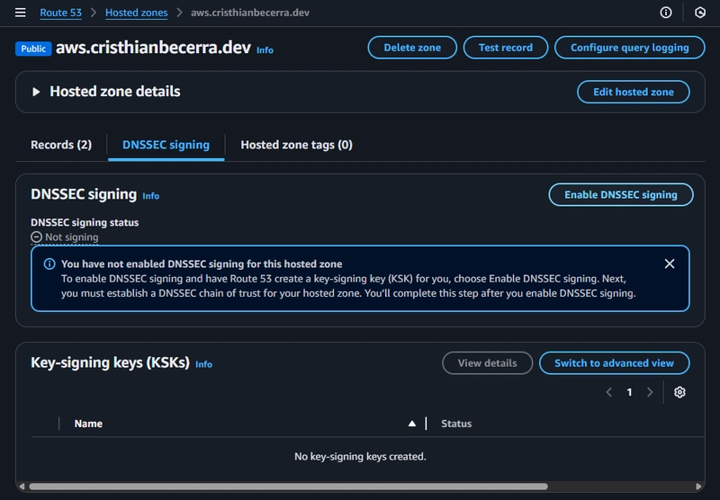 Esta guía asume que ya cuentas con una Hosted Zone en Route 53 correctamente configurada para tu dominio. Lo que haremos será implementar DNSSEC sobre dicha Hosted Zone y a lo largo de toda la cadena de confianza.