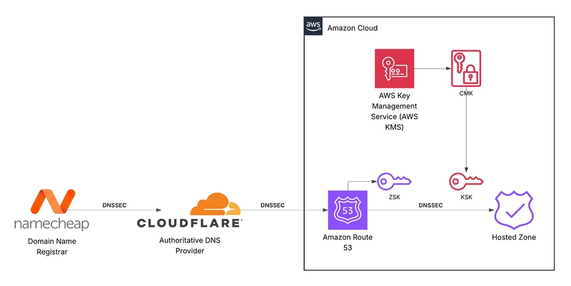 TL;DR: Este artículo te guiará en la implementación de DNSSEC para tus dominios en Amazon Route 53. Mostraré paso a paso cómo activar DNSSEC en tu zona alojada en Route 53 y cómo establecer la cadena de confianza entre el Domain Registrar (Namecheap) y los Authoritative DNS Providers (Cloudflare y Amazon Route 53), todo ello alineado con el pilar de Seguridad del AWS Well-Architected Framework. 🔐