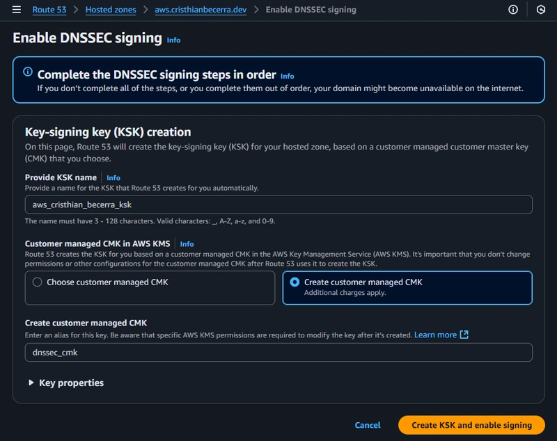 La implementación de DNSSEC por parte de Amazon Route 53 no tiene costo, y dado que ya contabas con el dominio, el único gasto asociado sería el correspondiente a la Customer Managed Key (CMK) utilizada para generar la Key Signing Key (KSK).💲