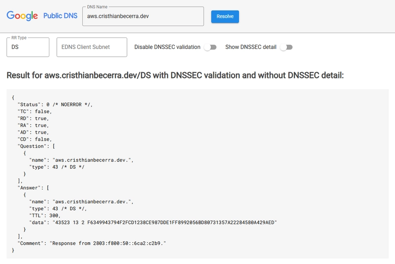 de tu dominio. Revisa la data de la respuesta y confirma que coincida con el registro DS de Route 53; si no coincide, la propagación aún no ha finalizado. ⌛