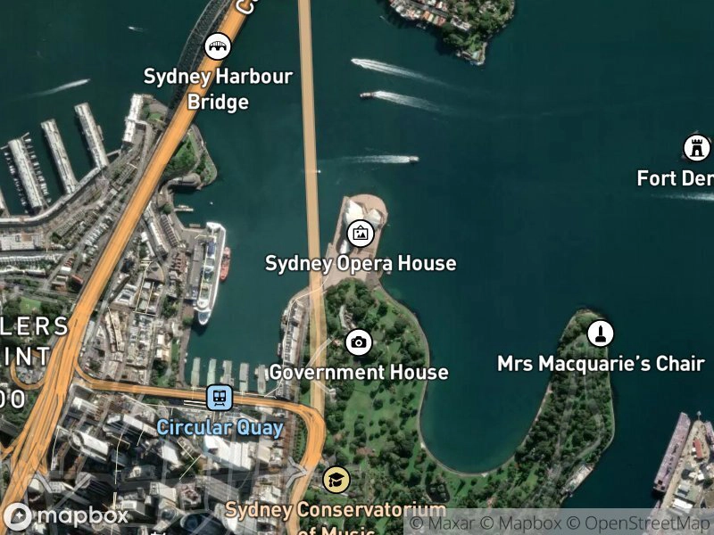The site of the Sydney Opera House in Sydney, Australia, using the Mapbox Satellite Streets style at zoom 13.63.