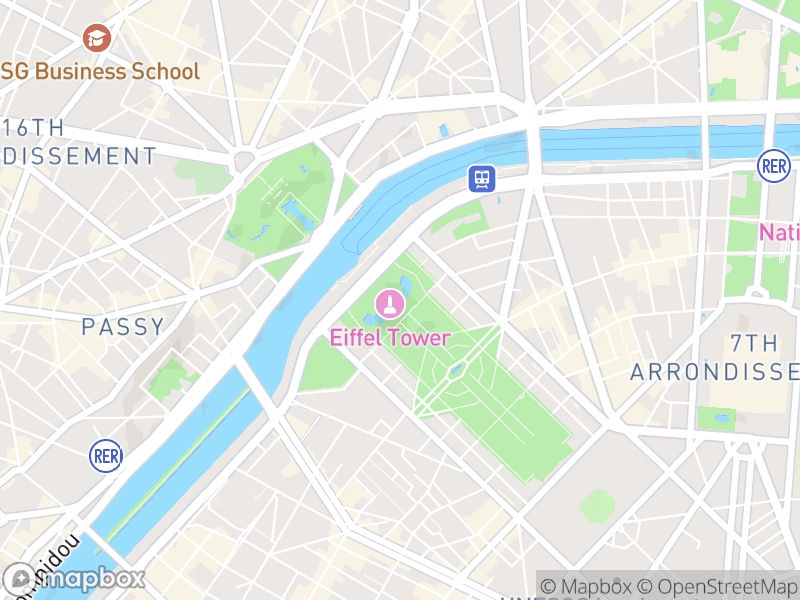 The site of the Eiffel Tower in Paris (2.295,48.8584), France, using the Mapbox Streets style at zoom 12.77: