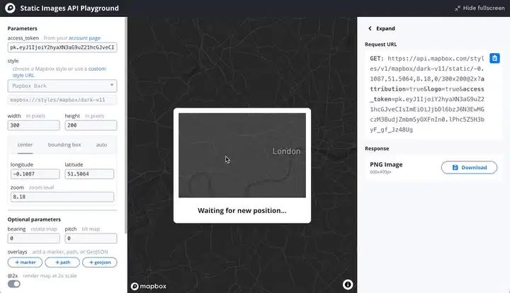 Overlays use a DSL and end up as sections of the URL. For example, a small (s) red (#b44646) marker at coordinates -0.1717,51.5068 is encoded as pin-s+b44646(-0.1717,51.5068). Don’t worry about the learning curve for encoding overlays, we made a Developer Playground to help you configure them.