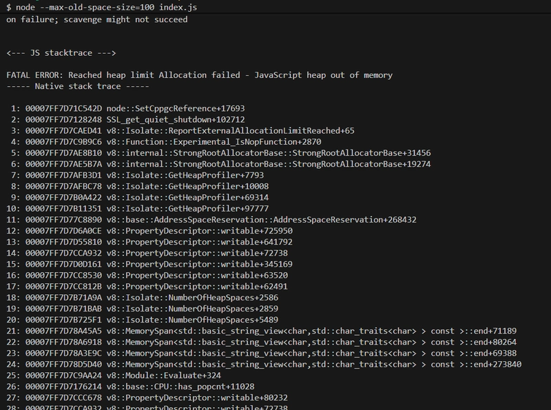 Dessa vez tivemos um erro do motor v8, usado pelo NodeJS para executar o javascript, por falta de memória para o nosso programa.