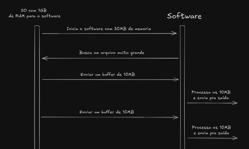 Já com streams lemos e processamos o arquivo em partes e não todo de uma vez. Carregamos 64KB do arquivo e mandamos escrever no console, depois carregamos mais 64KB e mandamos para o console e repetimos até o fim dos dados. Com isso, não usamos o nosso limite de 100MB inteiro e o programa finaliza com sucesso.