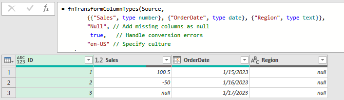 Description = "Transforms the 'Sales' column to a number and the 'OrderDate' column to a date. A missing 'Region' column will be added and filled with nulls.",
