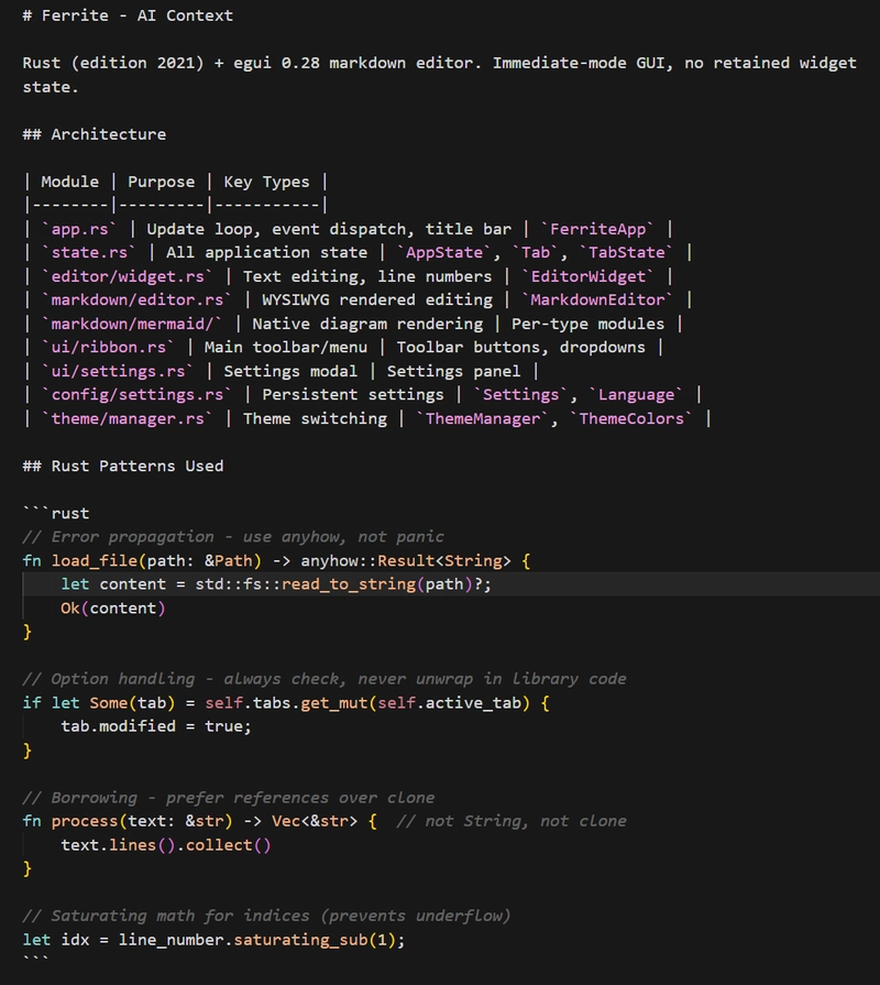 ai-context.md is a lean architectural reference I keep under 100 lines. It tells the AI how to write code that fits the codebase: module structure, key types, language patterns, framework idioms, and critical gotchas that cause bugs. Not what to work on (that comes from handovers), but how to write code that belongs here.
