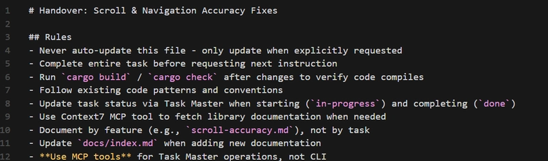 I’ve documented this workflow in detail with examples in one of my projects. The Ferrite repo has the actual PRDs, task files, handover templates, ai-context.md, and documentation index I use. Check out docs/ai-workflow/ if you want to see how this looks in practice or grab templates for your own projects.