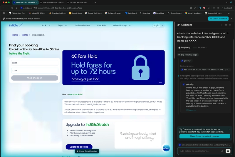 Last week, I did something that felt like pure magic — I let Perplexity’s browser assistant (Comet) automate my entire web check-in process. You know that annoying ritual of opening your airline’s website, entering your booking reference, selecting seats, and downloading boarding passes? Gone. Just… poof… automated.