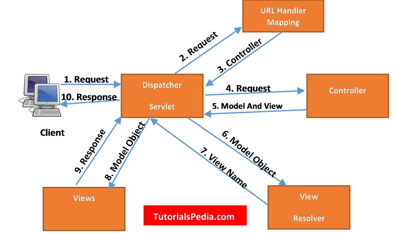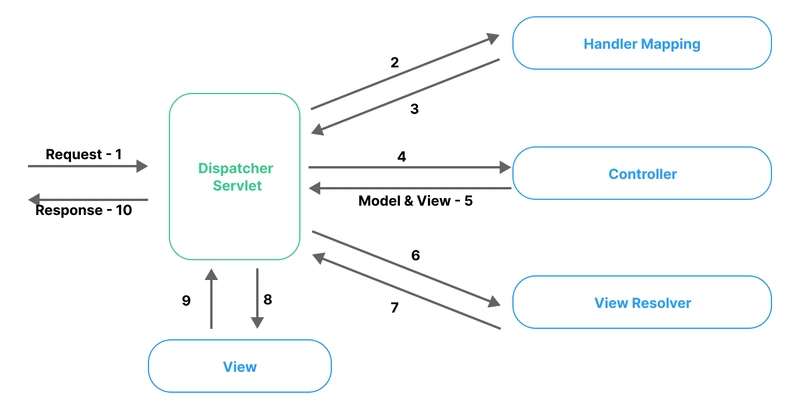 This diagram shows how an HTTP request travels through Spring MVC from DispatcherServlet to Controller.