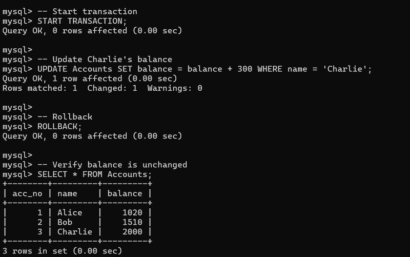 Insight: ROLLBACK undoes all changes made during the transaction. This is especially useful when an error occurs mid-operation or a condition fails validation.