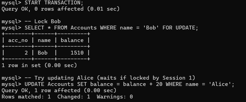Insight: SELECT … FOR UPDATE locks the selected row until the transaction is committed or rolled back. This prevents other sessions from modifying it, ensuring safe concurrent operations.