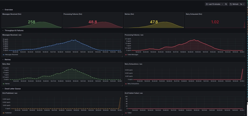 On the consumer side, we also track retry and DLQ behavior, alongside core processing metrics like:
