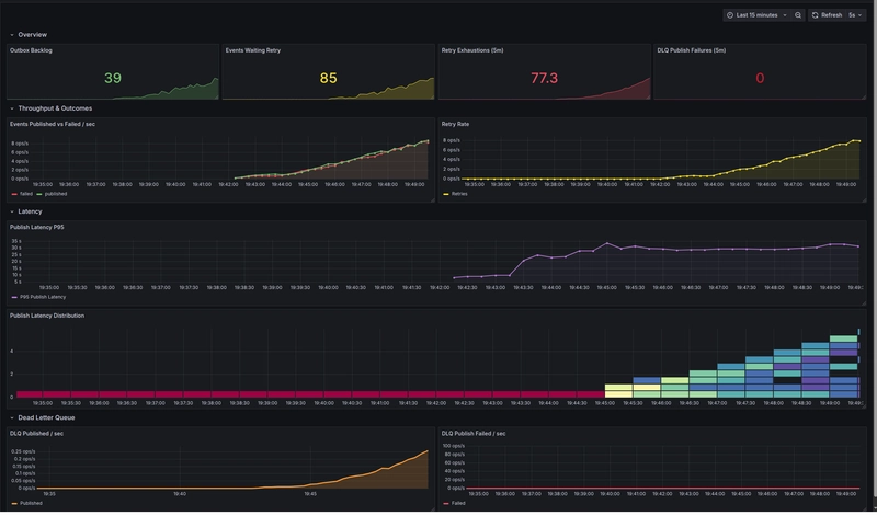 In Part 2, we extend the system from Part 1 with failure-aware behavior and operational guardrails, without changing the core model. The transactional outbox remains the source of truth; we simply make it resilient, observable, and easier to operate under load.