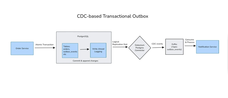 Instead of running a background worker that periodically polls the outbox_events table, CDC-based approaches stream database changes directly from the database’s write-ahead log (WAL) into a message broker. Tools like Debezium can capture inserts into the outbox table and publish them to Kafka topics with very low latency.