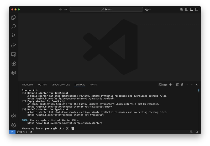 Accept the defaults, choosing JavaScript and selecting the empty starter kit.