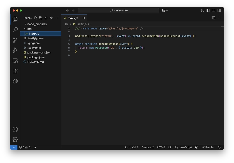 In src/index.js we’ll be writing our Compute logic to transform the HTML at the edge.