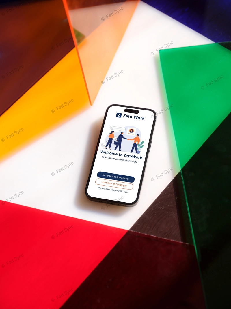 Fad Sync mobile app welcome screen mockup with clean branding, Flutter UI/UX design, and professional visual identity