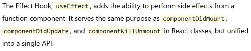 The way to write these effects in code is by using the useEffect hook, that accepts an effect function that returns a cleanup function and a dependency array of variables that are used in the effect.