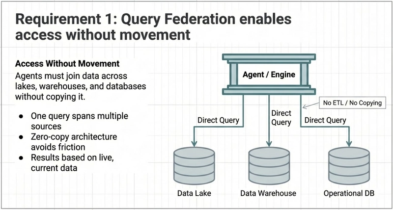 An AI agent must work across many data systems. These include data lakes, data warehouses, and operational databases. The agent must join data across these systems without copying it into a separate store.