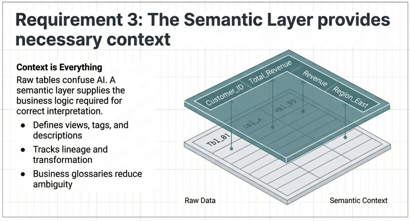 Raw tables lack business meaning. AI agents need context to choose the right data and apply it correctly.