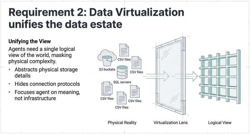 This matters for AI agents. Agents should reason about meaning, not infrastructure. Virtualization shortens the path from question to result and reduces error caused by system-level complexity.